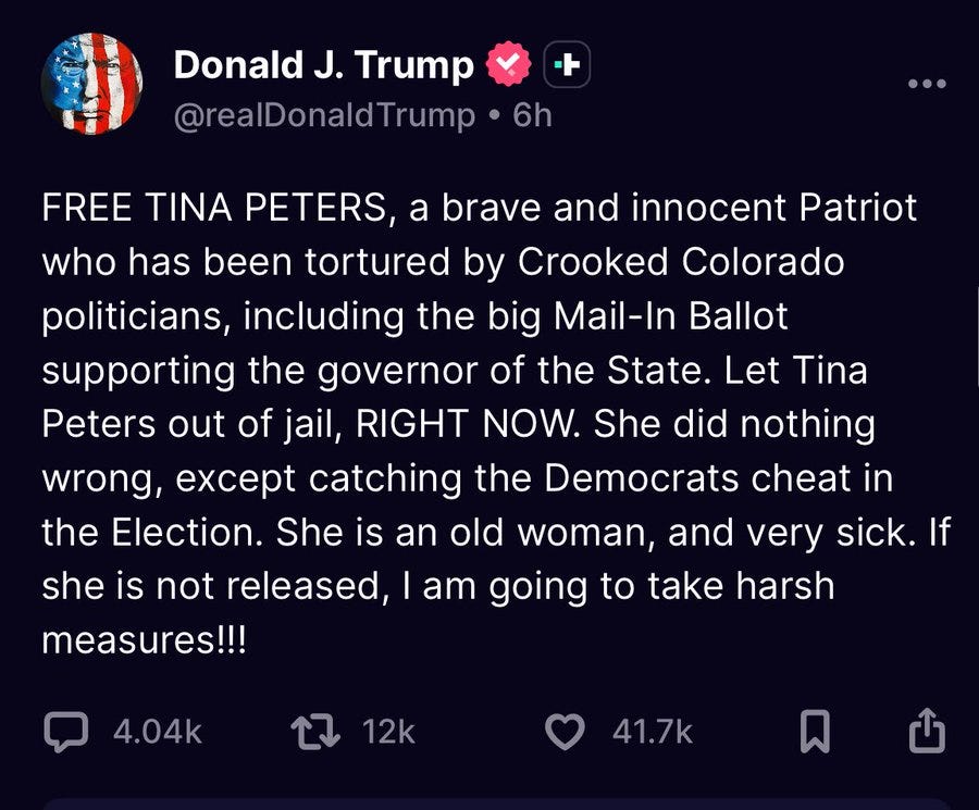 The primary lever that President Trump has to free Tina Peters is withholding federal funding. There are novel ideas about declaring her a federal witness, but in my opinion novel theories are a long shot. If it can work, awesome; but eggs and baskets and all that.