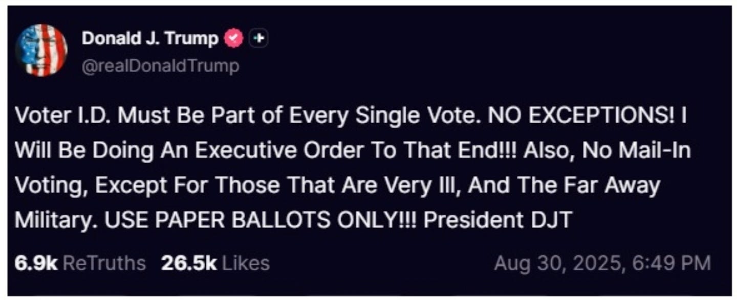 President Trump stands with us on this. He has said it loud and clear: the path forward is not to surrender to a broken system, but to fight it by overwhelming it with in-person votes they cannot manipulate away.