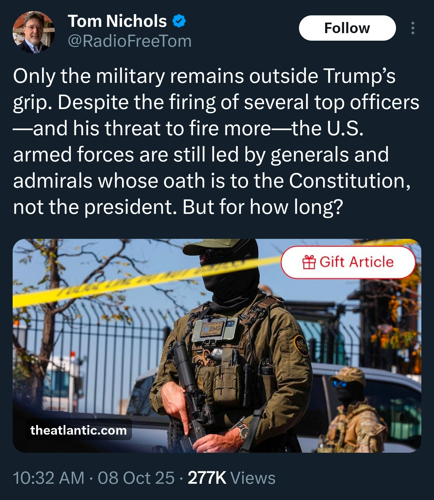 The article paints a picture where the military must act as a moral check against the Commander in Chief. But the Constitution doesn’t work that way. The military doesn’t get to pick which president to obey or which orders it finds “comfortable.” Once you open that door, you destroy civilian control of the armed forces, the very foundation of our republic.