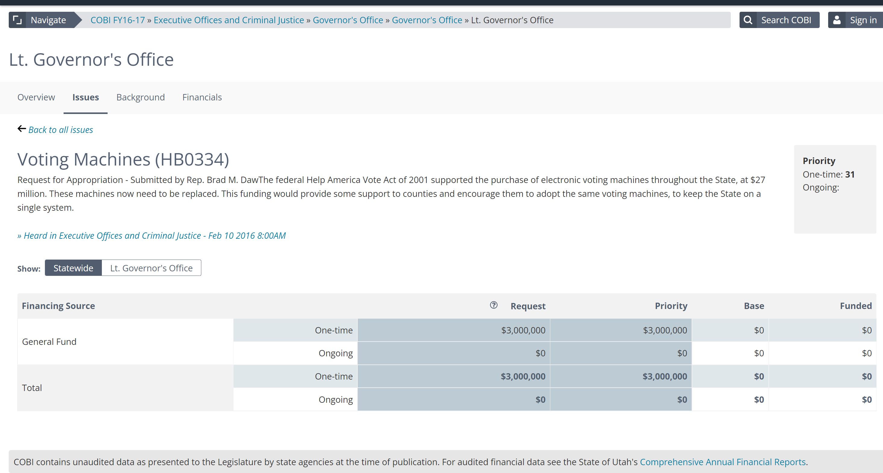 2016, governor, lieutenant governor, machines, money, UT, utah, utah follow money lieutenant governor 2016 UT Lt Gov Election Machines HB0334 screen shot