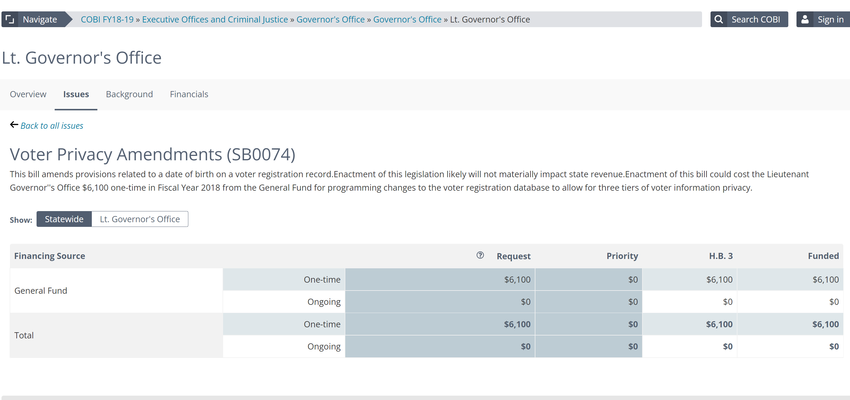 2018, 2018 UT Lt Gov voter privacy amendments funding SB0074 screen shot follow money Utah, funding, money, UT, utah
