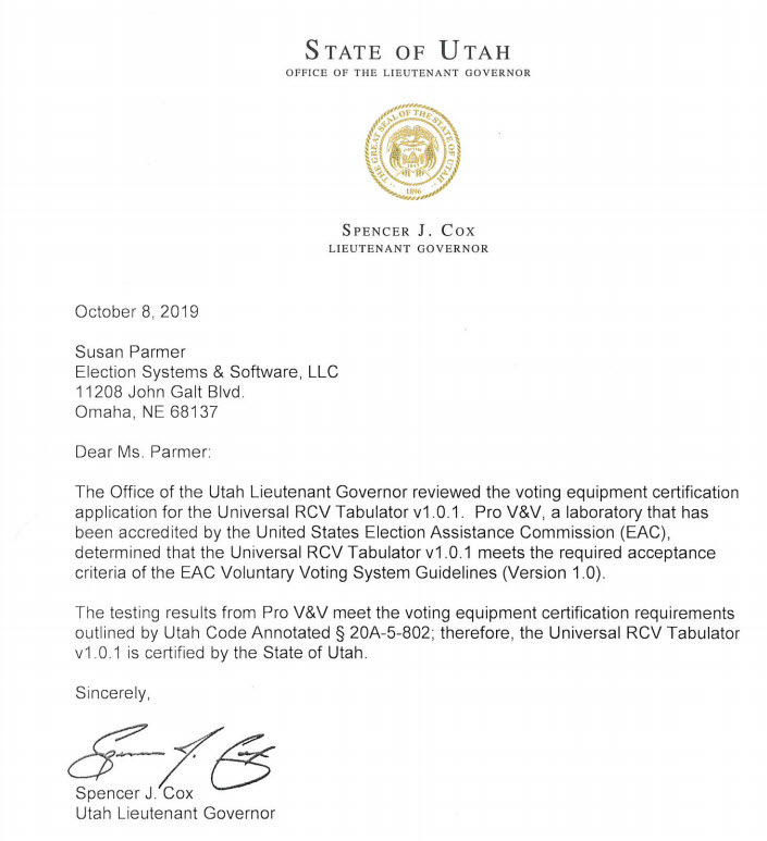 2019, 2019 Oct 08, 2019 Oct 08 UT RCV tabulator ProVV certification memo Spencer Cox image Utah ranked choice voting pro v and v, certification, pro v&v, UT, utah