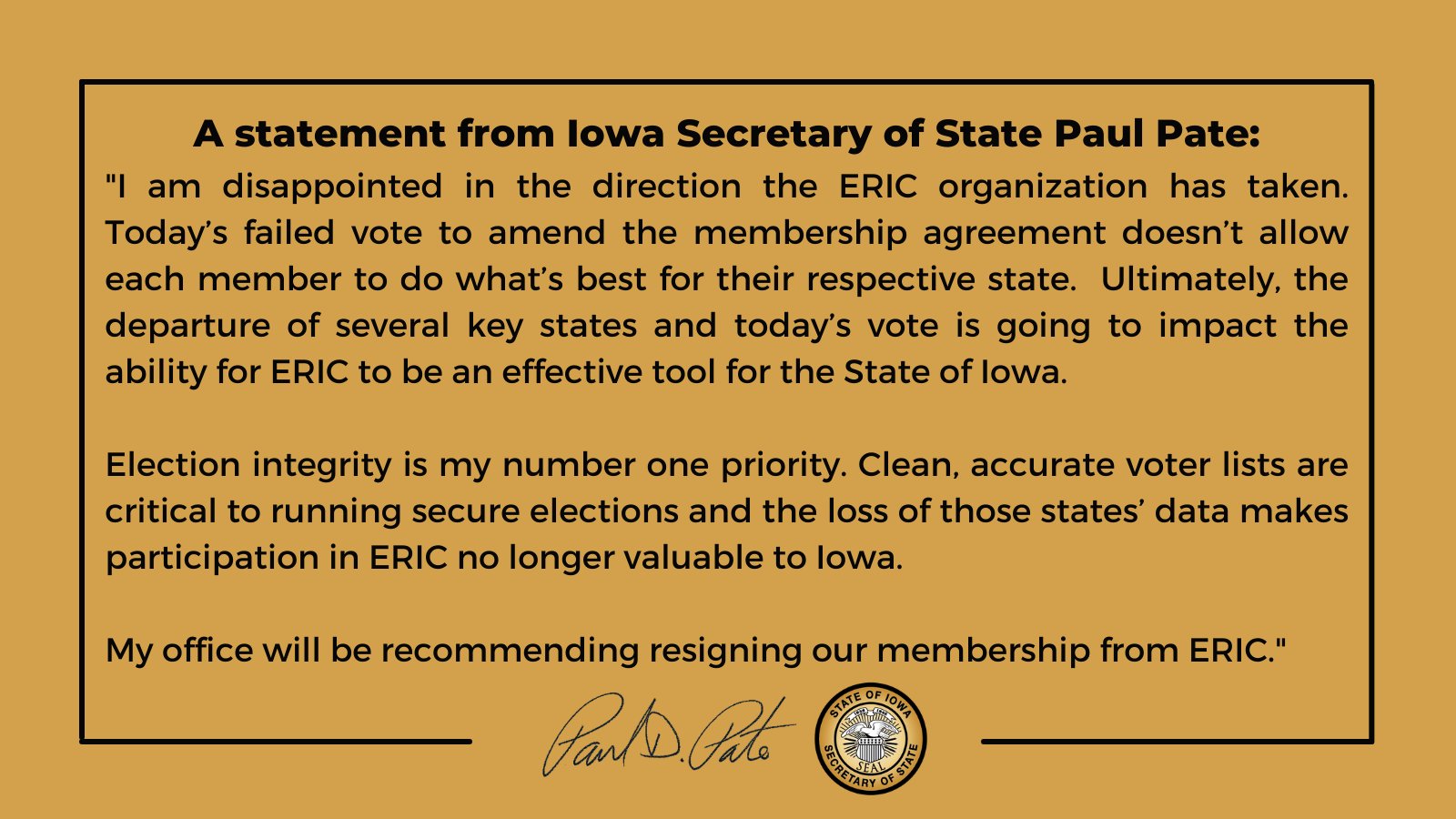 2023, 2023 Mar 17, 2023 Mar 17 IA ERIC Withdrawal Announcement Paul Pate Twitter electronic registration voter cancel Iowa, ERIC, IA, iowa, twitter, voter registration